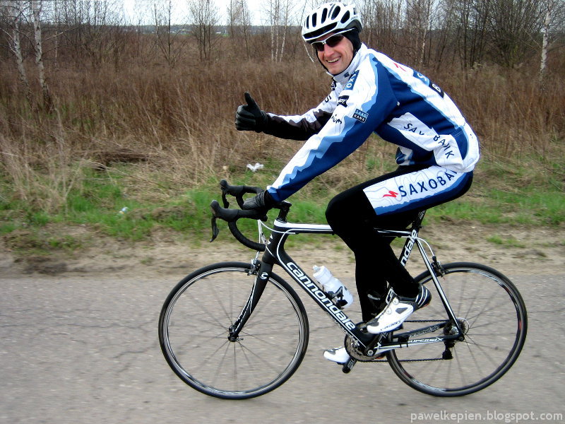 Tu pojawił się niestety mój pierwszy kryzys - nie wiadomo dlaczego, zaczął mnie strasznie boleć żołądek. Chociaż starałem się nie zostawać z tyłu, to miałem szczerą ochotę odpuścić i zawrócić, bo przed nami było jeszcze kilkadziesiąt kilometrów. Właściwie aż do puszczy brzuch nie dawał mi spokoju, ale na szczęście sytuacja wróciła w końcu do normy i kręciło mi się już nieco lepiej. Dalej jechaliśmy ok. 40 km/h, co zaczynało dawać mi (i nie tylko mi :D) się we znaki. Druga żółta kartka dla Witka za naprawdę mocne (dla mnie, cieniasa :)) zmiany i pierwsza dla Artura - za to samo :)
